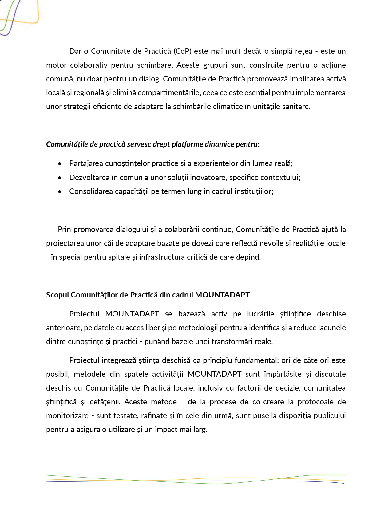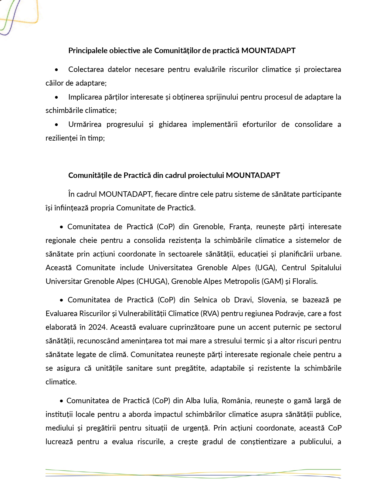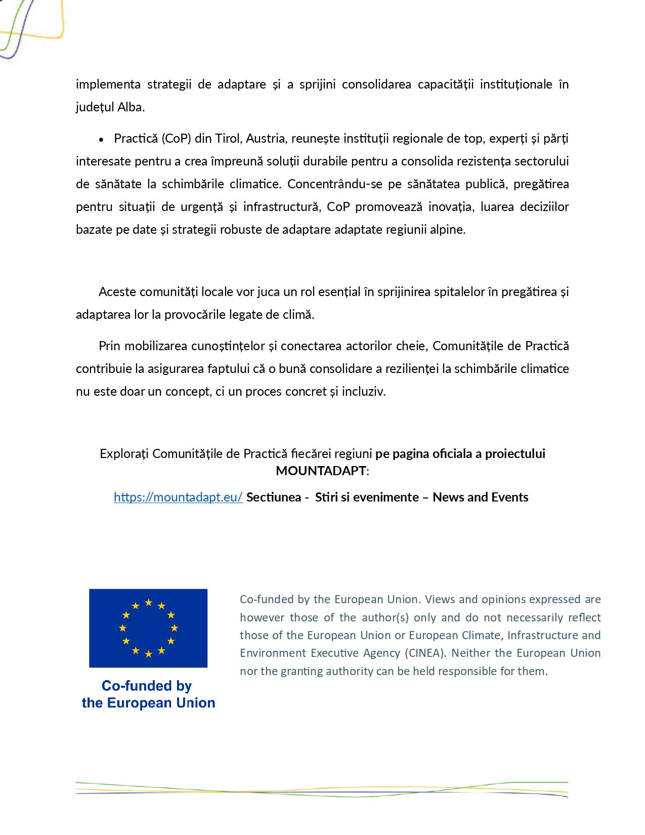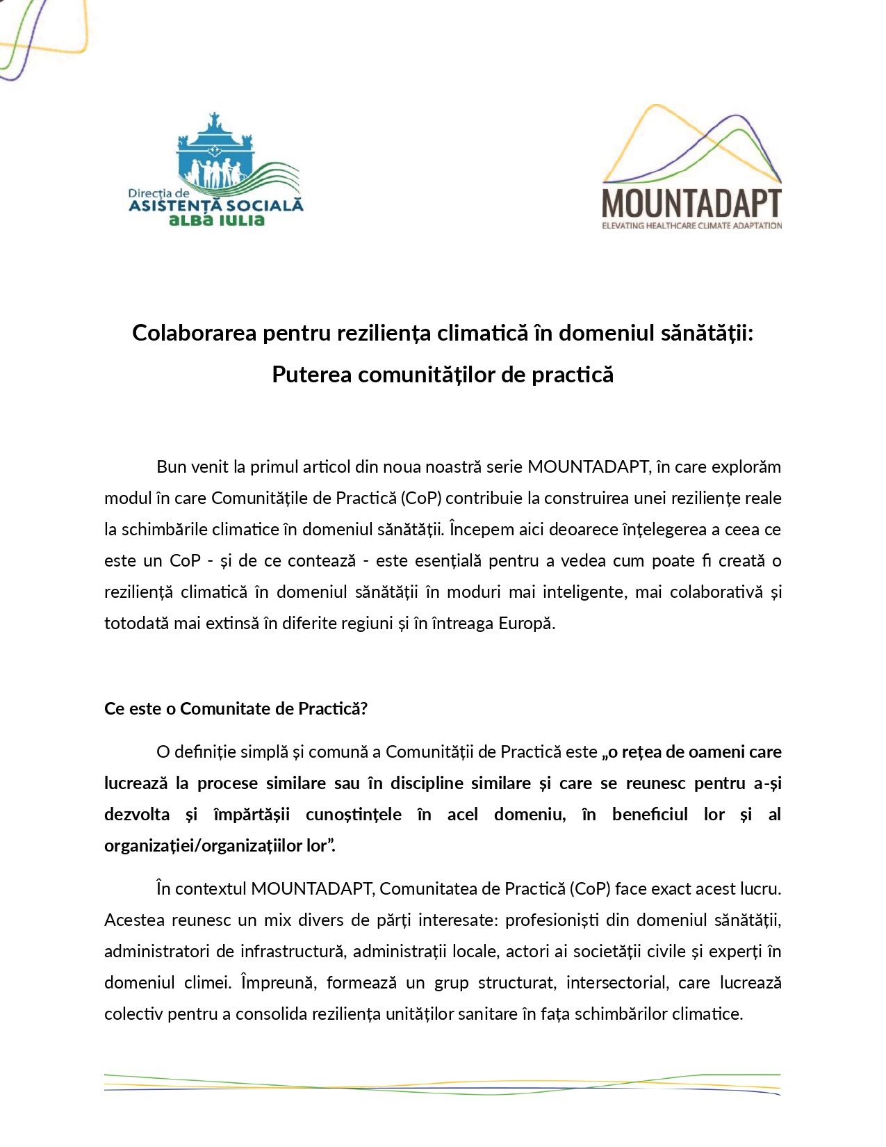 Proiecte cu finantare europeana Colaborarea pentru reziliența climatică în domeniul sănătății: Puterea comunităților de practică 14/08/2025 Vezi articolul Site-ul oficial MOUNTADAPT Continue Reading Previous COMUNICAT DE PRESĂ – Semnare Contract Servicii de Proiectare și Execuție Lucrări pentru proiectul „Înființare Centrul de zi pentru persoane adulte cu dizabilități ”Orizonturi” Alba Iulia”Next Communitatea de Practică MOUNTADAPT din Alba Iulia: Construirea unui răspuns coordonat la provocările climatice și de sănătate” V-ar putea interesa și: Proiecte cu finantare europeana Communitatea de Practică MOUNTADAPT din Alba Iulia: Construirea unui răspuns coordonat la provocările climatice și de sănătate” 14/08/2025 Proiecte cu finantare europeana COMUNICAT DE PRESĂ – Semnare Contract Servicii de Proiectare și Execuție Lucrări pentru proiectul „Înființare Centrul de zi pentru persoane adulte cu dizabilități ”Orizonturi” Alba Iulia” 22/05/2025 Proiecte cu finantare europeana Lansarea activităților de îngrijire la domiciliu în cadrul Proiectului Centrul de zi pentru copii „ReCreativ” 20/05/2025 Lasă un răspuns Anulează răspunsulAdresa ta de email nu va fi publicată. Câmpurile obligatorii sunt marcate cu *Comentariu * Nume * Email * Site web Salvează-mi numele, emailul și site-ul web în acest navigator pentru data viitoare când o să comentez.