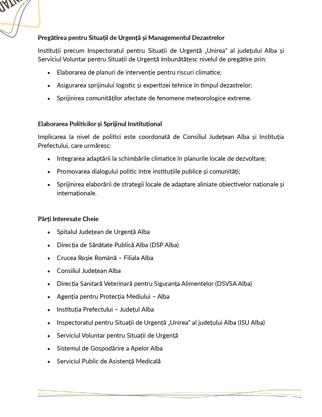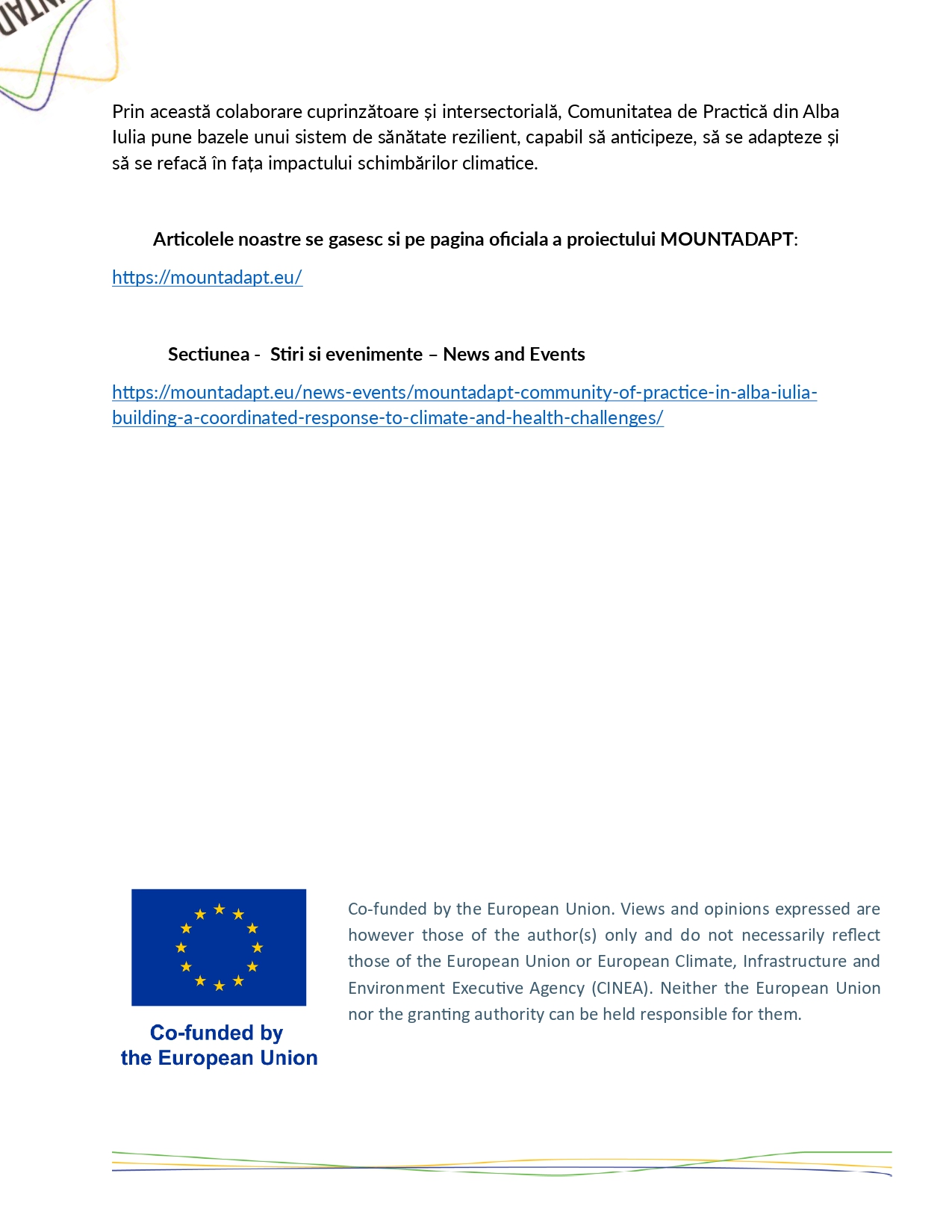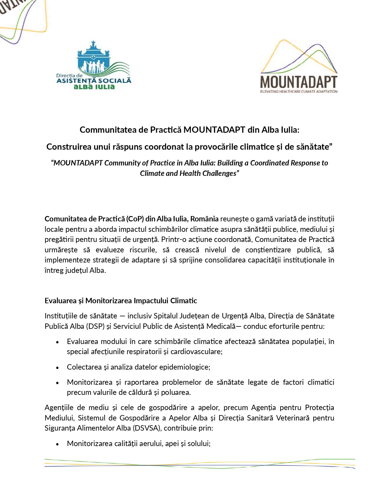 Proiecte cu finantare europeana Communitatea de Practică MOUNTADAPT din Alba Iulia: Construirea unui răspuns coordonat la provocările climatice și de sănătate” 14/08/2025 “MOUNTADAPT Community of Practice in Alba Iulia: Building a Coordinated Response to Climate and Health Challenges” Vezi articolul Site-ul oficial MOUNTADAPT Continue Reading Previous Colaborarea pentru reziliența climatică în domeniul sănătății: Puterea comunităților de practică V-ar putea interesa și: Proiecte cu finantare europeana Colaborarea pentru reziliența climatică în domeniul sănătății: Puterea comunităților de practică 14/08/2025 Proiecte cu finantare europeana COMUNICAT DE PRESĂ – Semnare Contract Servicii de Proiectare și Execuție Lucrări pentru proiectul „Înființare Centrul de zi pentru persoane adulte cu dizabilități ”Orizonturi” Alba Iulia” 22/05/2025 Proiecte cu finantare europeana Lansarea activităților de îngrijire la domiciliu în cadrul Proiectului Centrul de zi pentru copii „ReCreativ” 20/05/2025 Lasă un răspuns Anulează răspunsulAdresa ta de email nu va fi publicată. Câmpurile obligatorii sunt marcate cu *Comentariu * Nume * Email * Site web Salvează-mi numele, emailul și site-ul web în acest navigator pentru data viitoare când o să comentez.